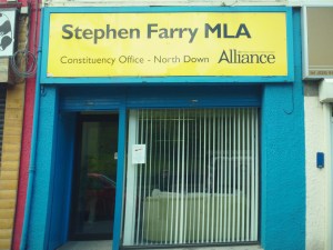 This one is the office of Stephen Farry MLA, currently the Minister for Employment and Learning. His office does not mention Alliance Party benefactor Rowntree Trust/Foundation or their advisor Stratagem. I think the lettering “MLA” is a little too big. And points also lost for being….well the Alliance Party.