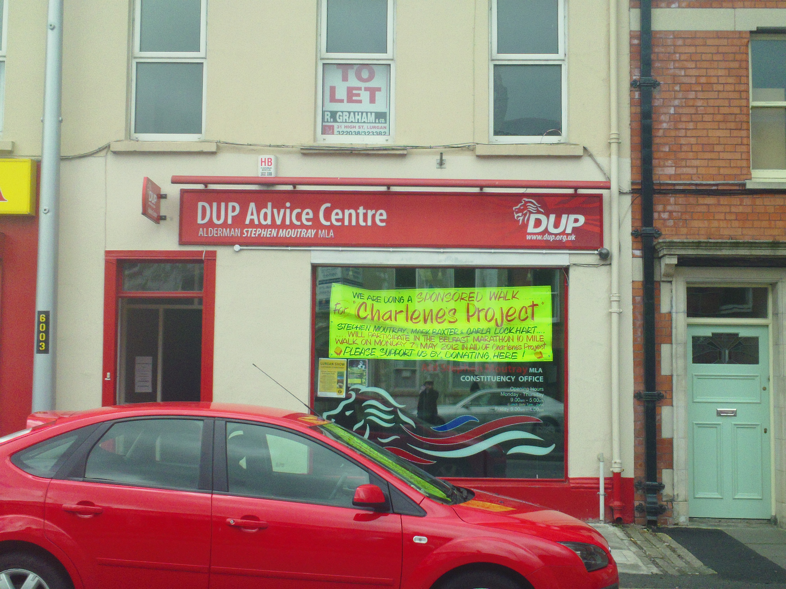 Unlike the Bangor offices of Stephen Agnew and Stephen Farry, this office highlights the fact that it is a “DUP Advice Centre”. Although Moutray takes second billing to his Party, he rather pompously uses his full title “Alderman Stephen Moutray MLA”. On the plus side his window has a banner announcing that he and two DUP councillors will be involved in a Charity Walk at Stormont in aid of “Charlenes Project”….a charity started by a young girl in nearby Dollinstown to help Ugandan children. The office is the most spacious that I have seen. And there are no blinds or screens to block a view of the interior. There is a small waiting area and constituents are dealt with at a counter.