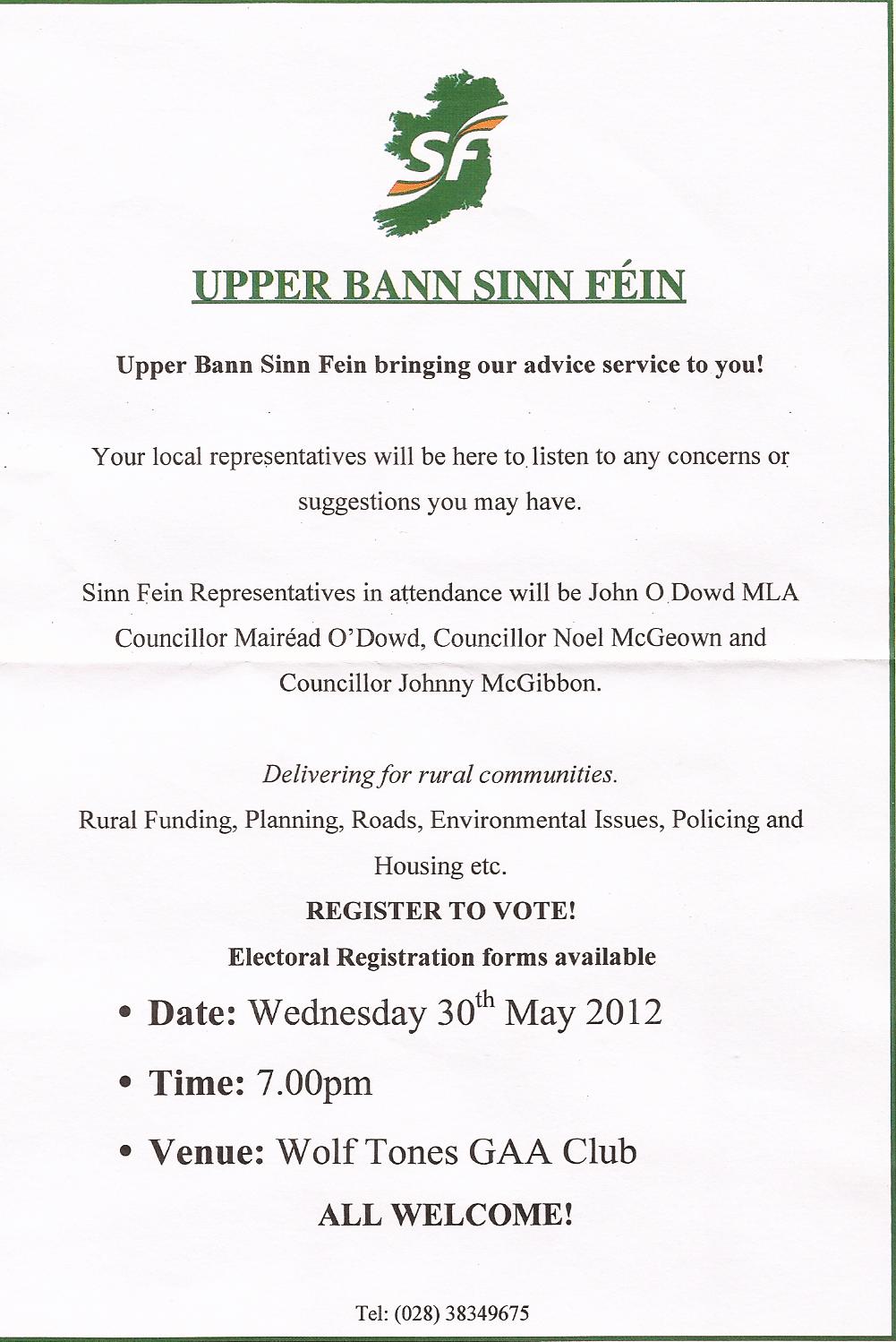 Last week in the small village of Derrymacash leaflets were distributed by Sinn Fein noting an advice clinic would be held in the local GAA Club…the Wolfe Tones. But local residents were left to scratch their heads…because the residents, many of them members of a fast growing club realised that the GAA cannot host such events. While it is safe to assume that all members of the Club, situated in the nationalist Loughside DEA in Craigavon Council area. Effectively it is made up of four small villages…..Derrymacash/Aghacommon, Derrytrasna, Aghagallon (all nationalist and where the local GAA clubs are the main social hub) and the Bannfoot area (unionist).