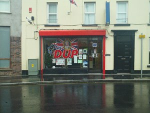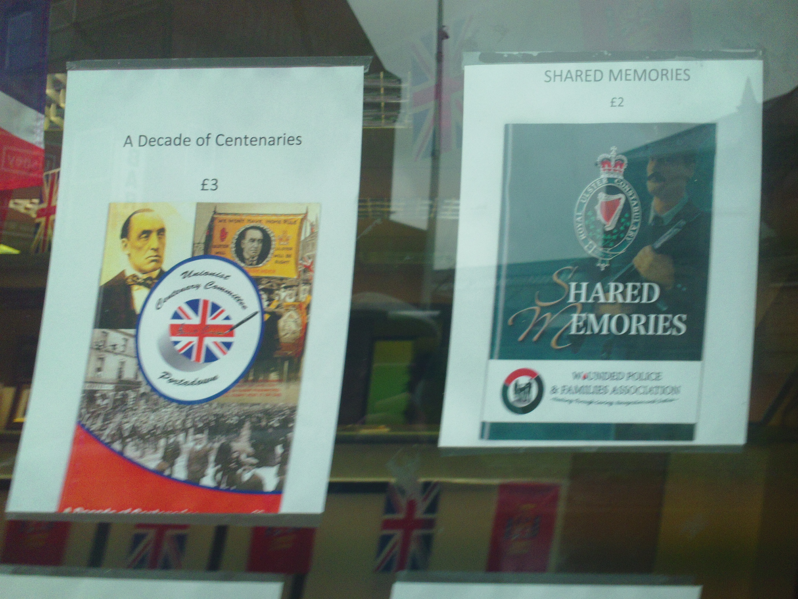 Posters in the window include “A Decade of Centenaries” (seemingly a booklet concentrating on unionist centenaries) and “Shared Memories” (seemingly about the old RUC). As an example of DUP “outreach”, there is a poster detailing band parades in the summer……..all the way to October.