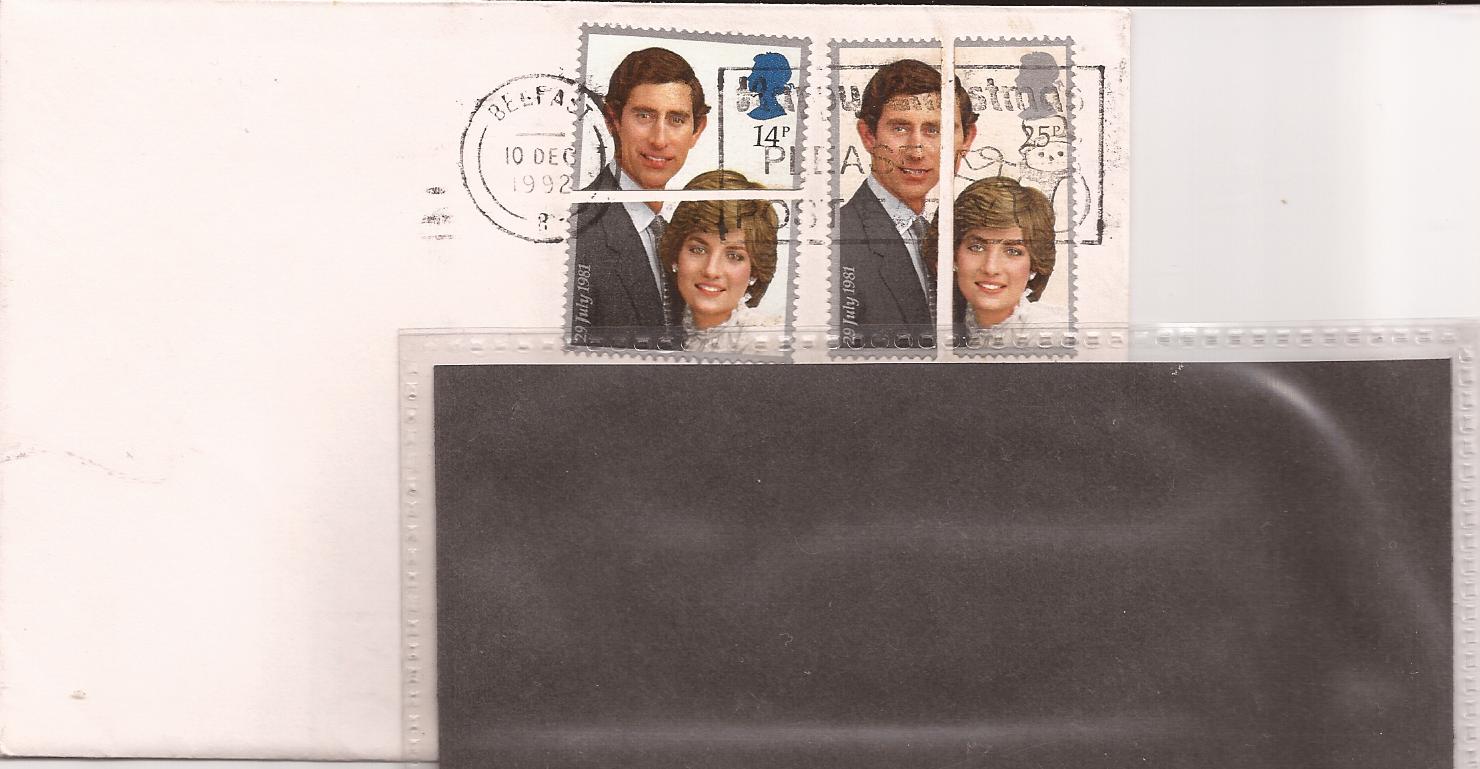 In December 1992, I was in London and it was already known that the marriage of “Prince Charles” was in trouble and there was speculation that a seperation was about to be announced. I went into Stanley Gibbons Stamp Shop in the Strand and bought the two stamps issued to commemorate the Wedding of Charles and Diana. “Royal Wedding” stamps are popular world-wide but obviously there was never going to be a stamp to commemorate the “Royal Seperation”. I thought it was an event that needed to be commemorated. When I flew home I cut the stamps in two with a horizontal cut on one stamp and a vertical cut on the other…..literally seperating the “Royals”. I put the stamps on an envelope and carried it around in Belfast for a couple of days…until John Major announced the seperation in the British House of Commons….when I ran outside and dropped the envelope in a post box. You might be able to make out the postmark “Belfast 10th December 1992”, the date of the seperation.