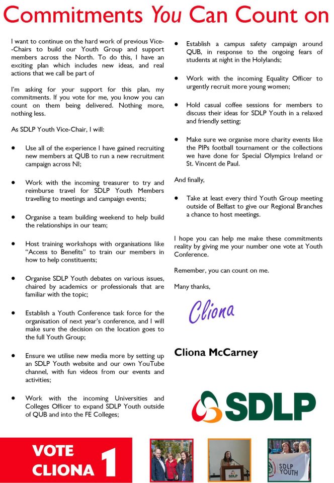 It was the 1980s and I had left SDLP before the Youth Group actually got off the ground. So it does my old heart a lot of good to see that the Next Generation are so strong within the Party. Among those “boldly going” is Cliona McCarney who is running for SDLP Youth Vice Chair. Cliona is from South Belfast and just finishing her first year at Queens University. I am happy to endorse her campaign.