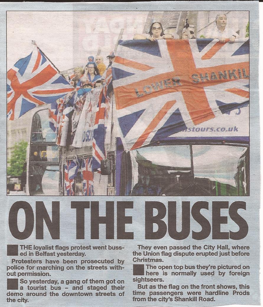 Yesterday photographs started appearing on Facebook. Posted by folks who were in Belfast and saw one ofthose open top buses used for tours of the City. Seemingly taken over by flegs protestors. So welcome to Belfast then.
