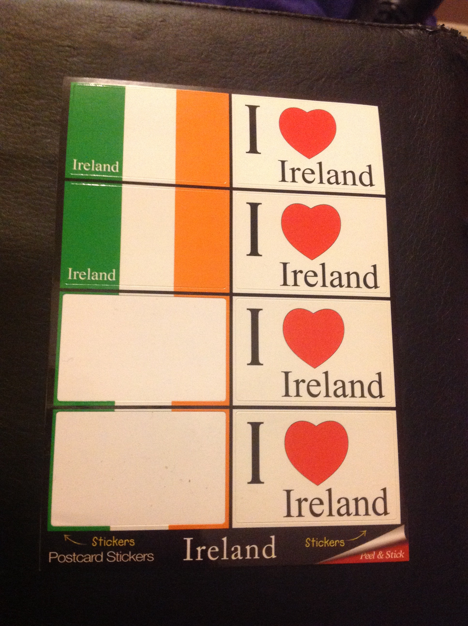 I am surprised that nobody has pointed out that Easons Bookshop in O’Connell Street in Dublin sells “sticker” postcards. One card features the National Flag of Ireland. I have a supply of them. I use them on mail, north and south. The cards cost 40 cents each…three for €1. See above.