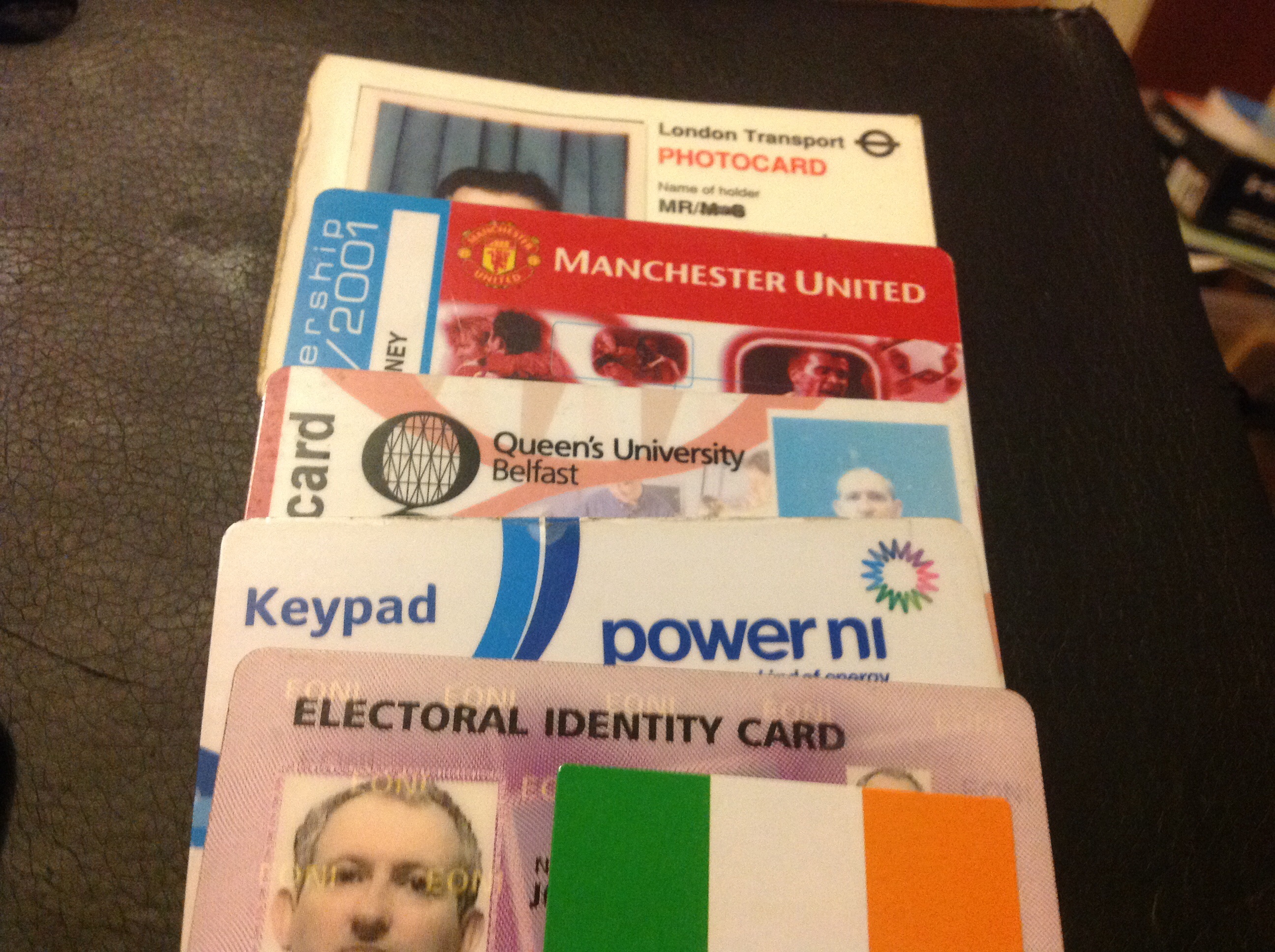 See also a selection of Driver Licence sized-cards that I have in my desk drawer. Manchester United Supporters Club, Queens University Student, London Transport, Electricity Key Pad, Electoral Office Voting Identity. I have now put an Irish Flag on them all. That’ll show ’em.