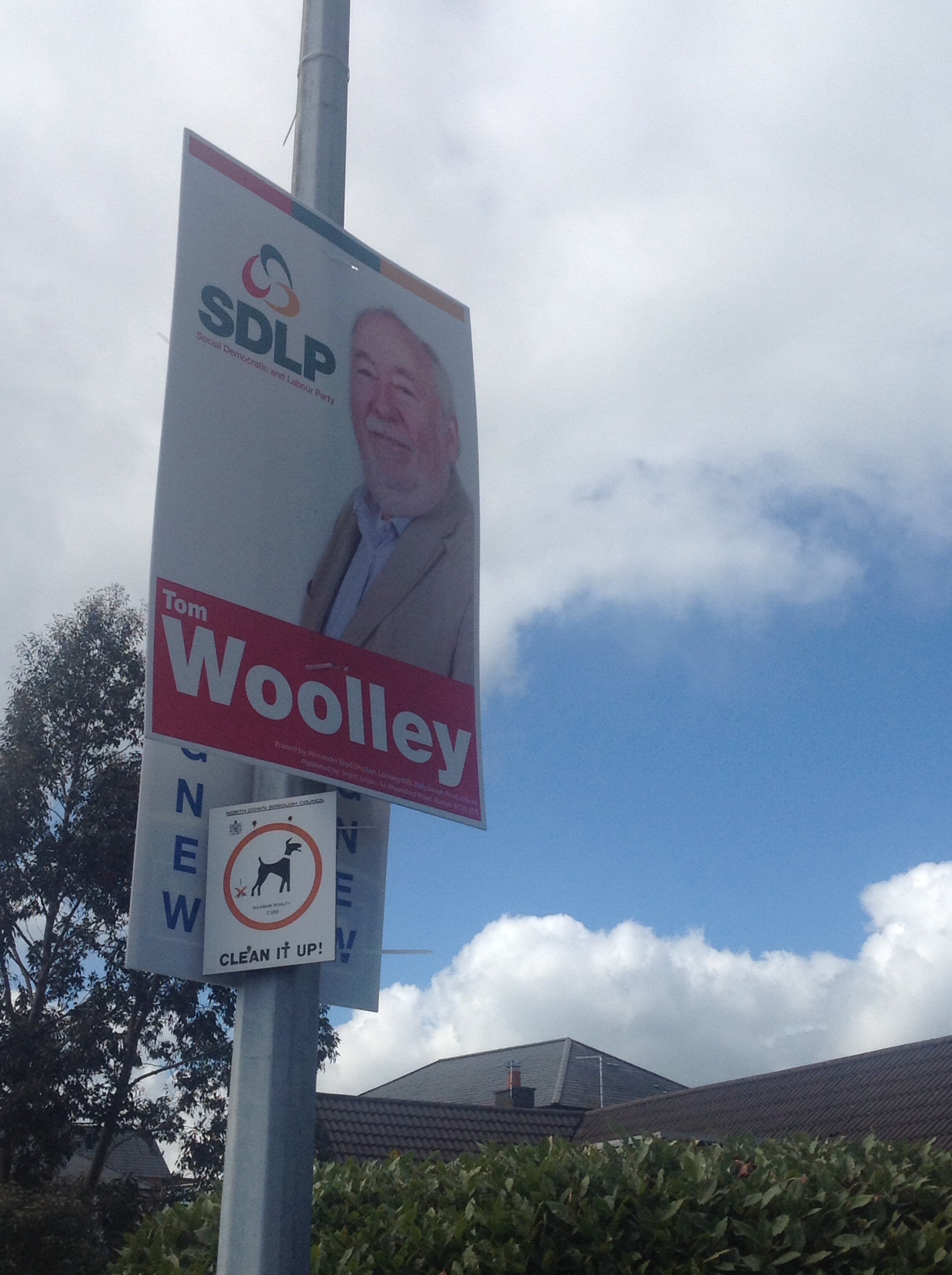 Bangor, County Down. The roundabout at Brunswick Road-Maxwell Road. Tom Woolley, SDLP candidate for North Down. There was a second poster which had been defaced and it appears some SDLP posters have been removed.