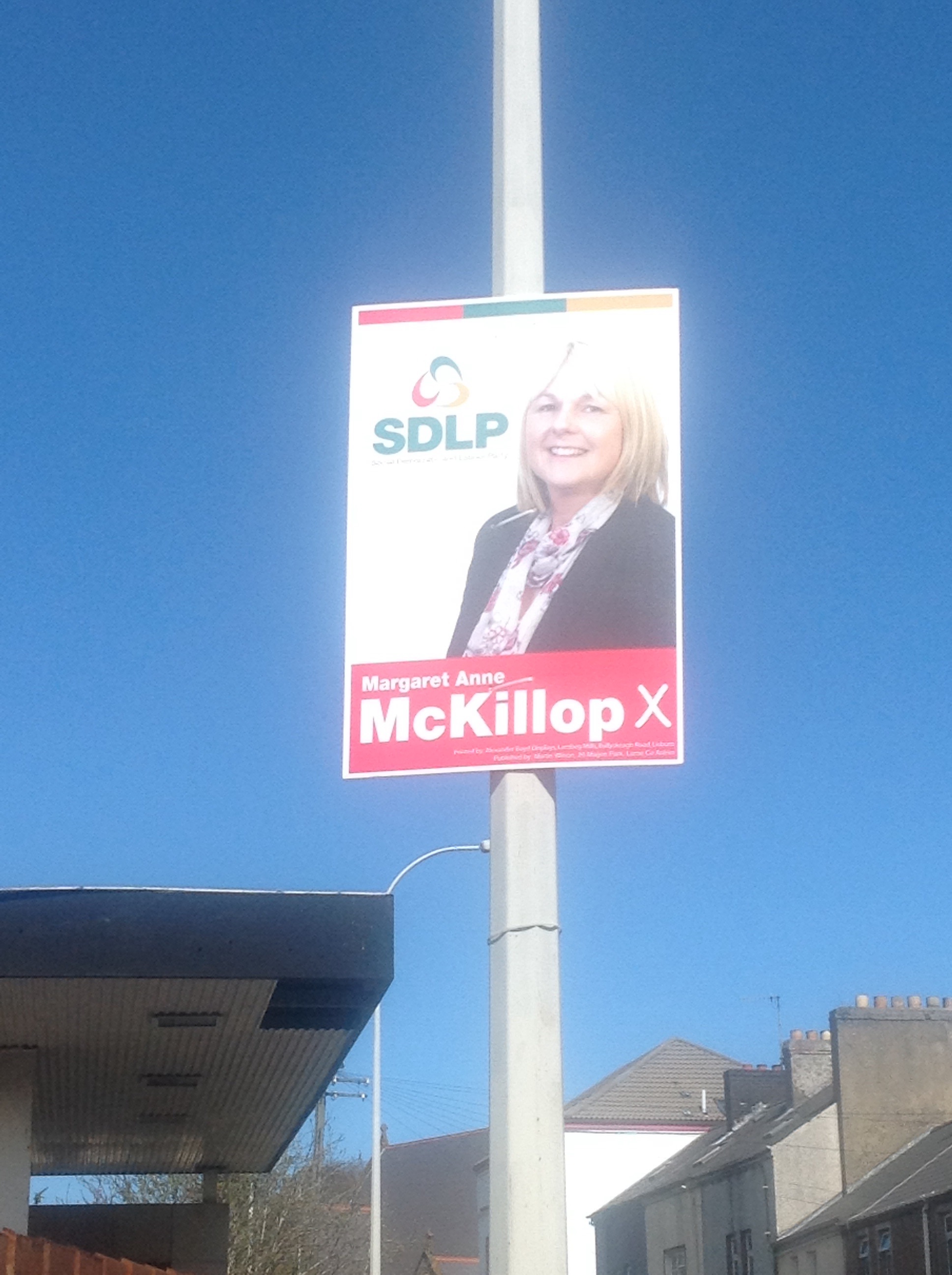 Margaret Anne McKillop, SDLP candidate for East Antrim. I wasn’t expecting SDLP posters in Larne. There are some on Circular Road, near the railway station and another group at the Laharna Shopping Mall.