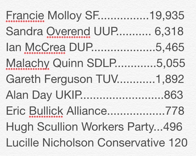 An easy victory for Sinn Féin and little here to upset the narrative for 2016. No change. Sinn Féin will take three seats, UUP, DUP and SDLP one each. Interesting that there is clear blue water between Sandra Overend and Ian McCrea. It certainly looks like this is a place where TUV can chip away at DUP. A respectable showing by UKIP, Alliance and Workers Party.