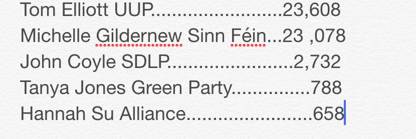 So why was it that….last week….. at 6.30am on a train with with wifi connexion, I was completely indifferent to the fact that Tom Elliott (UUP) had just defeated Michelle Gildernew by over 500 votes. After all, UUP and DUP had entered into a blatant sectarian pact.