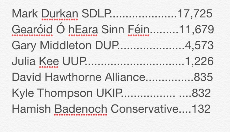 There has been hype for years that Sinn Féin are closing in on the SDLP in Derry. But it was all smoke and mirrors. Mark Durkan scored an easy win. The margin suggests that SDLP will comfortably retain three Assembly seats and Sinn Féin will take two seats. There is a unionist quota and DUP likely to retain the seat.