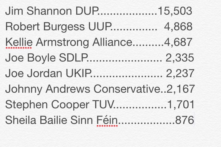 The sixth seat…the combination of UKIP (David McNarry holds a seat here), TUV and Tory, should be enough to hold off SDLP challenge. Joe Boyle did well here. But nationalists under-perform, in part because the nationalists are spread thinly in pockets around the constituency.