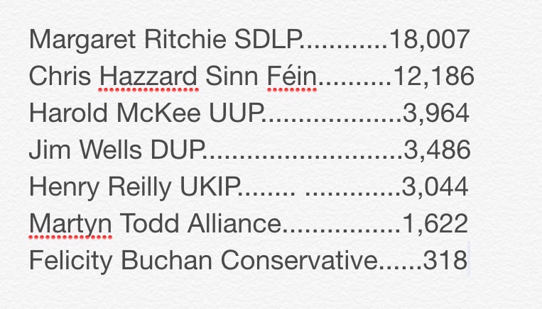 A straightforward win for Margaret Ritchie. Her Sinn Féin opponent, Chris Hazzard was hyped as a serious challenger but ultimately he was a well-beaten docket.