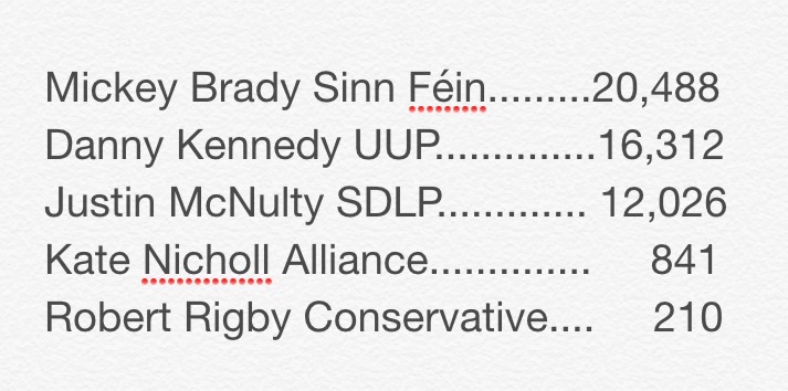 Mickey Brady of Sinn Féin won but it seemed as much to do with Incumbency than anything else. In the early part of the campaign, SDLP felt they were making a lot of progress but ultimately the Unionist Pact, where DUP stood aside for Danny Kennedy (UUP) was the deciding factor. The fear that a single unionist could come thru to win may not have saved Brady but it was certainly a factor.