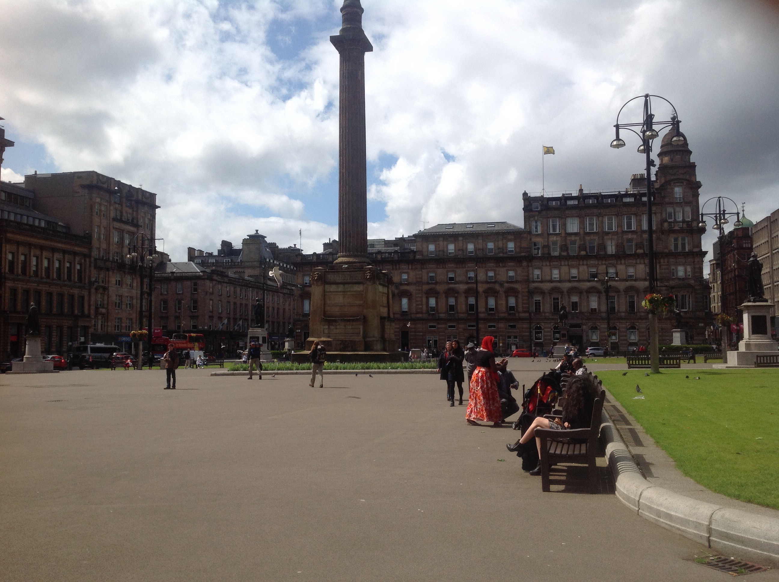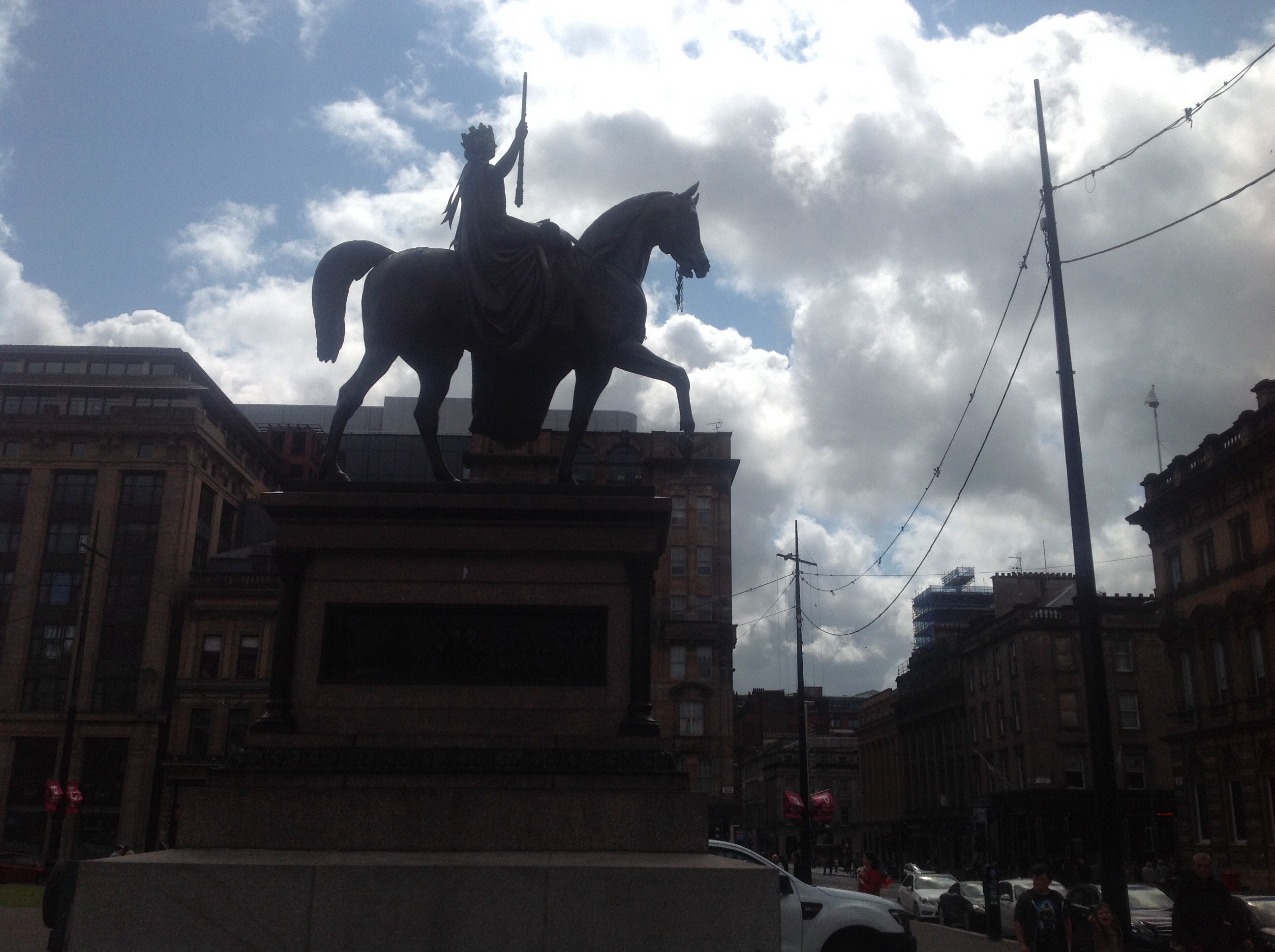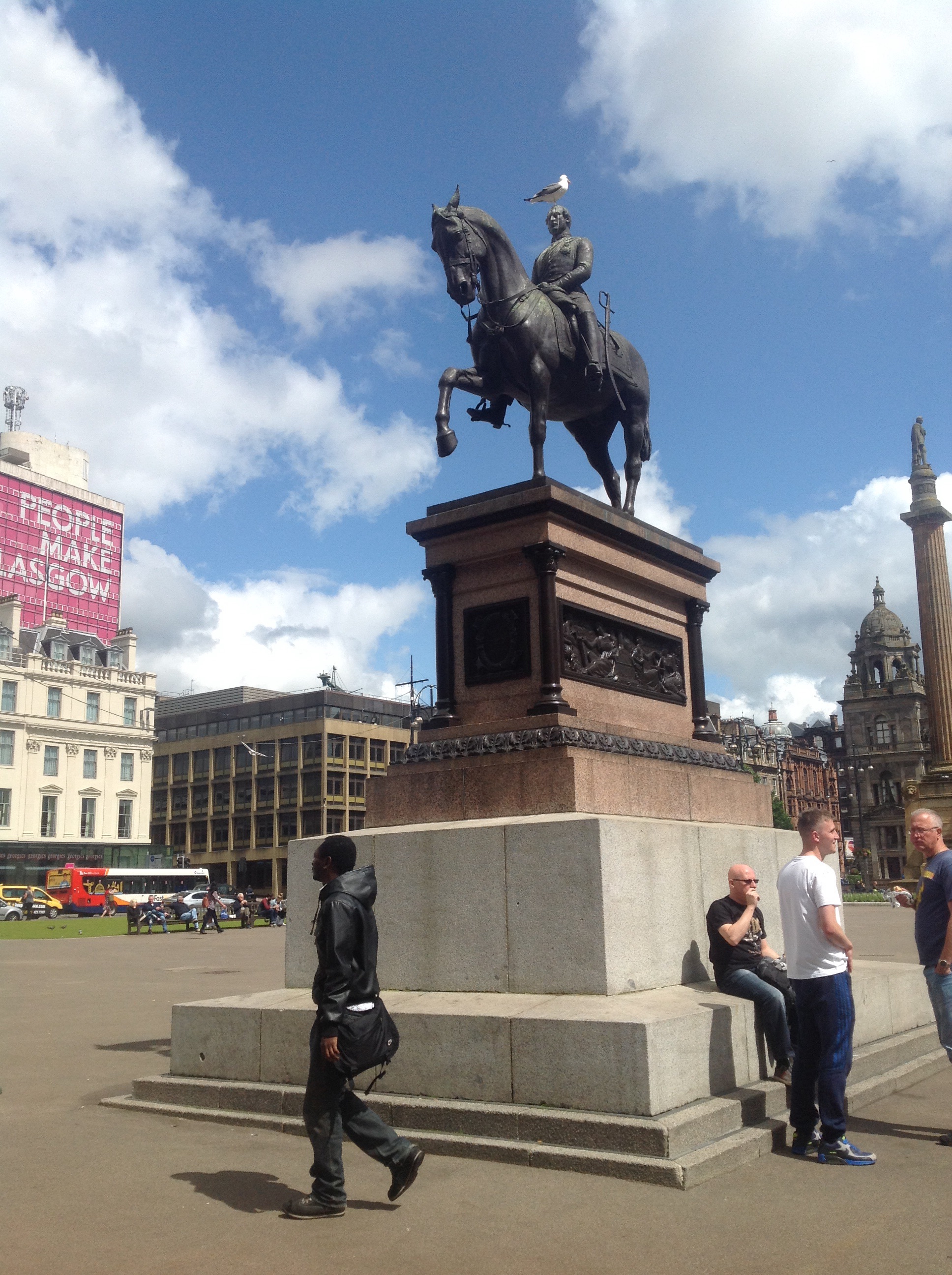 George Square is still George Square. The pillar with whatever “King George”, who gives his name to the Square. This is “Establishment”…Georgian meets Victorian…Robert Peel, William Gladstone and the Cenotaph. This is the Square where Glasgow comes together. Unlikely equestrian statues of Victoria and her consort Albert…it seems a parody.