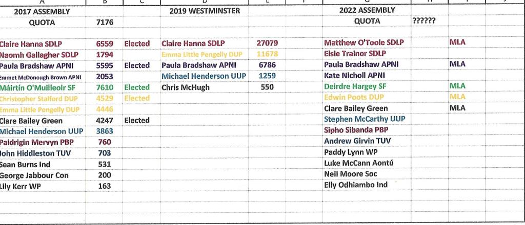The quota for 2022. Probably 7,000 votes is as good a figure as any. So on the face of it Claire Hanna’s thumping 27,000 votes in 2019 could be three quotas. Of course this massive vote includes votes that would normally go to Sinn Féin and the Green Party. This was a result of the anti-Brexit pact with those parties. In a “first past the post” election Claire would probably have won, on SDLP being the best placed to take the seat from DUP. Old fashioned tactical voting.
