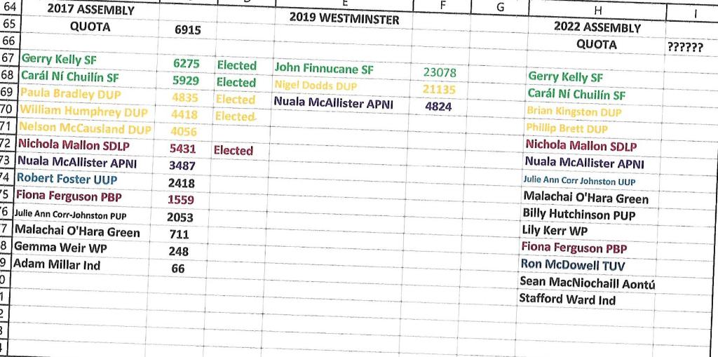 The spreadsheet shows Assembly 2017 and Westminster 2019 results. For the benefit of folks in USA, it is important to understand that Assembly is decided in eighteen constituencies where having a quota of votes is required to win one of five seats. And Westminster is decided on a simple “first past the post” vote. I also include the runners and riders for 2022.