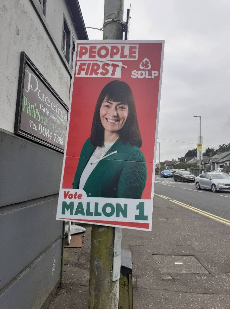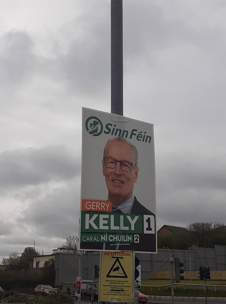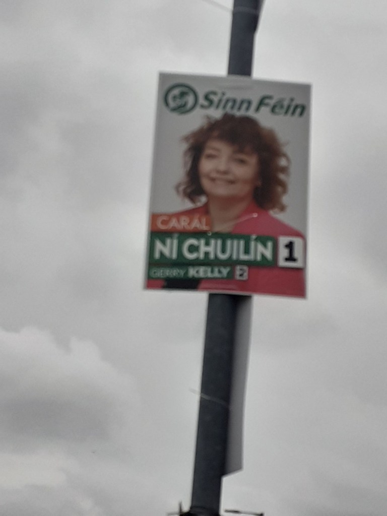Gerry Kelly posters are in the Upper Antrim Road and Glengormley and Caral Ní Chuilín posters in the New Lodge Road area. Both are former republican prisoners. The Finucane vote in 2019 includes loaned votes from Green Party and SDLP …probably a total of 7,000 votes. That should leave enough for two quotas. But not safe.