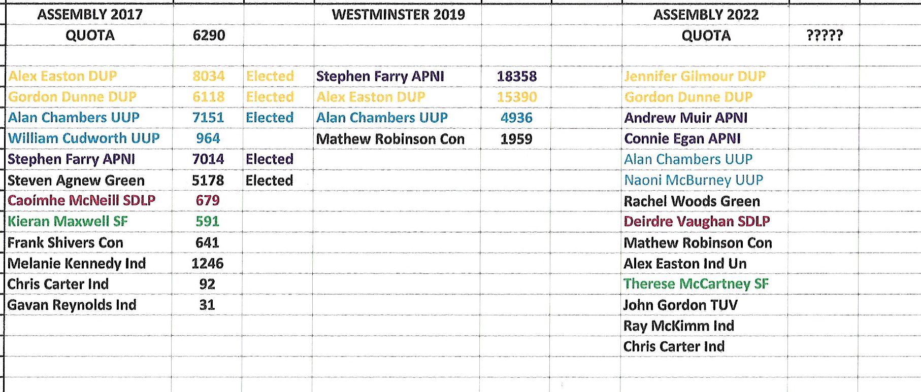 The spreadsheet shows Assembly 2017 and Westminster 2019 results. For the benefit of folks in USA, it is important to understand that Assembly is decided in eighteen constituencies where having a quota of votes is required to win one of five seats. And Westminster is decided on a simple “first past the post” vote. I also include the runners and riders for 2022.
