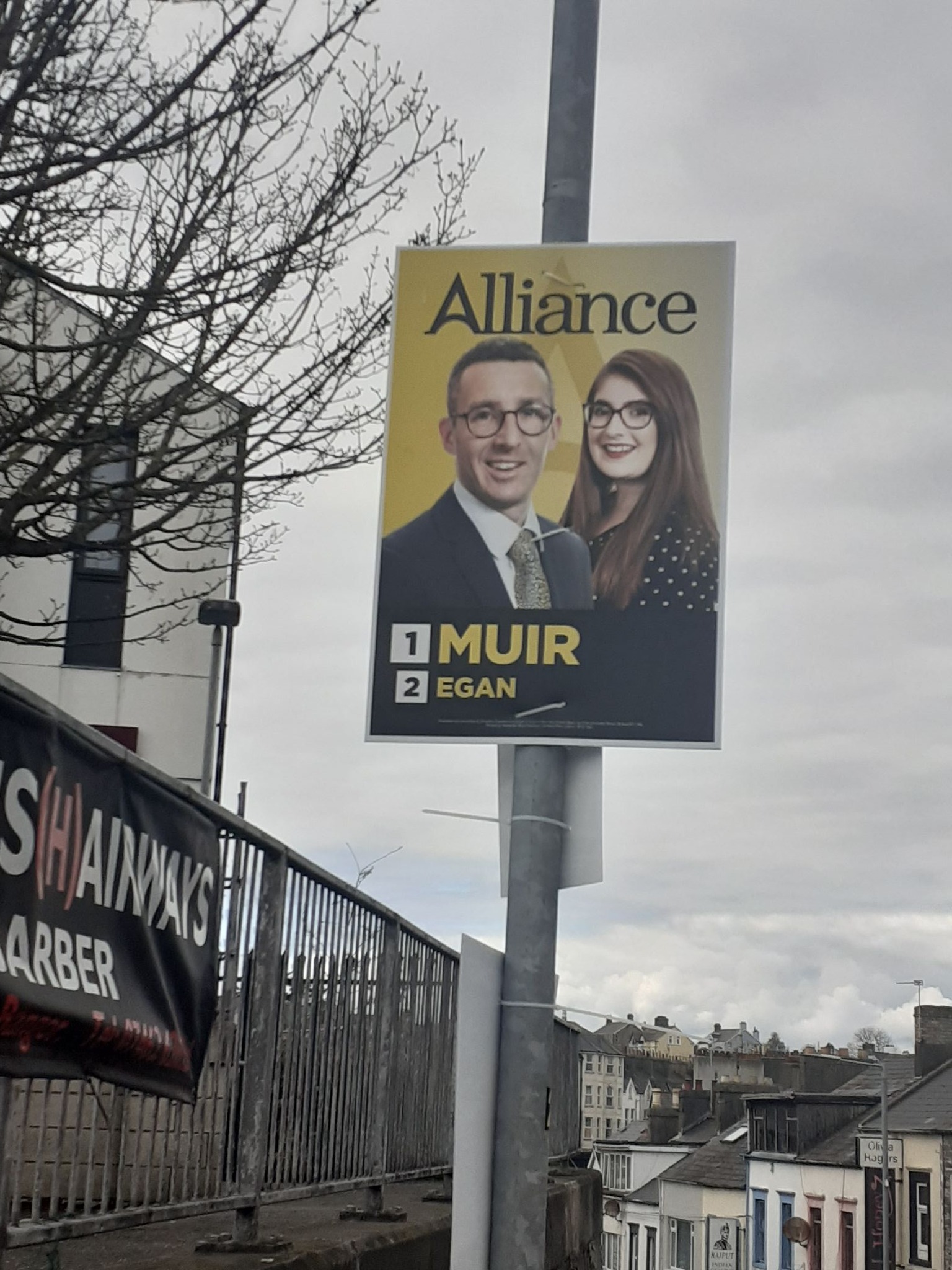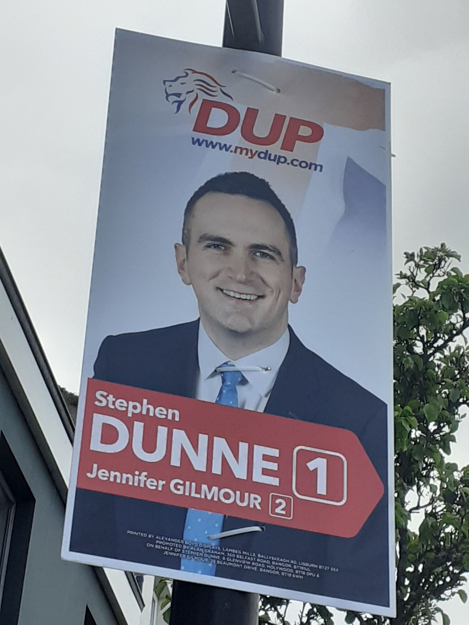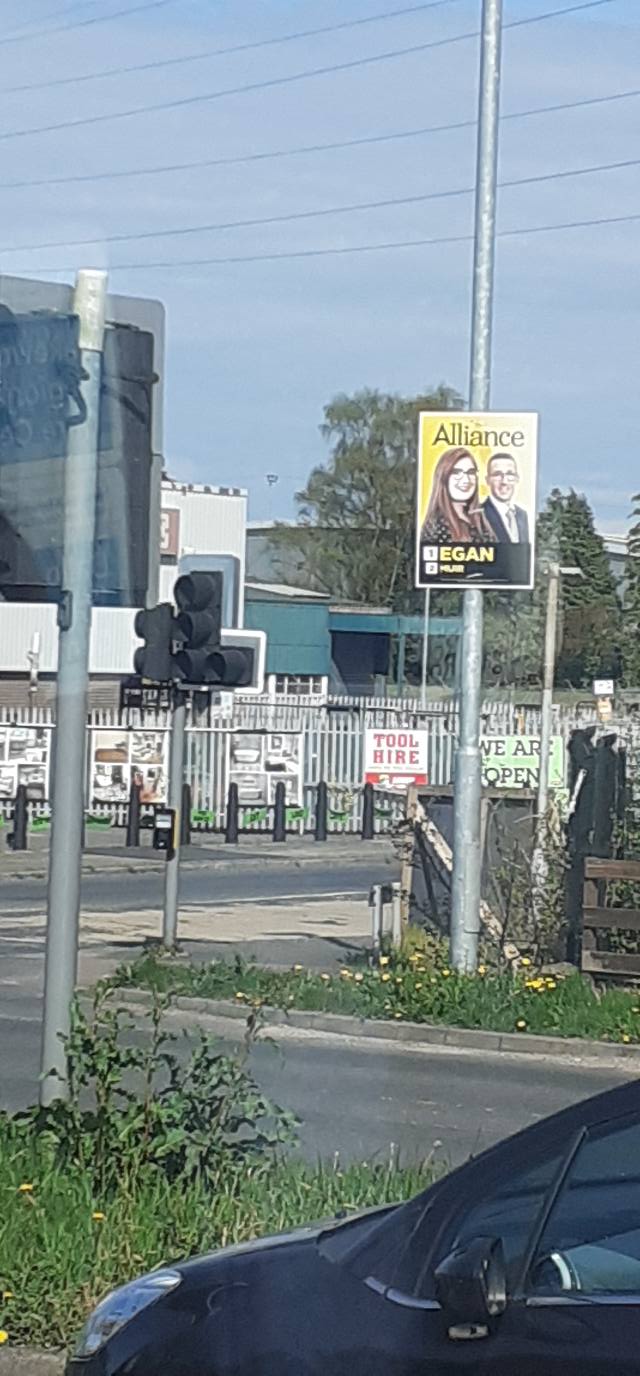 The mantle of Alliance front-runner goes to Andrew Muir. He seems to have the lions share of the election posters around Holywood and Bangor. Running mate, Connie Egan seems to be based in other parts of the constituency. The only posters I could photograph where seen from a bus.