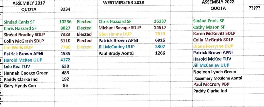 The Sinn Féin candidates are Cathy Mason who was co-opted to replace Chris Hazzard when he went to Westminster and Warrenpoint-based Sinéad Ennis. The two most recent elections suggest two quotas.